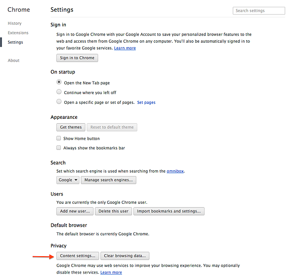 Click the Google Chrome Menu icon to the right of the address bar and then select the "Settings" menu option. Alternatively type "chrome://settings/" into your address bar. Click the "Show advanced settings...”