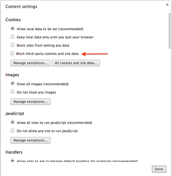 Make sure that the "Block third-party cookies and side data is NOT set and click "Done".